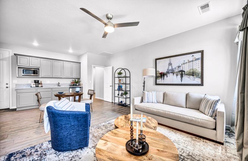 This charming single-story home offers three bedrooms and two baths within its 1,376 square feet of thoughtfully designed space. The open living area connects the kitchen and dining space, perfect for gatherings. The primary bedroom features an en-suite bathroom, while the second and third bedrooms offer versatility for an office, guest room, or workout space. The Aspen provides comfort and convenience in a compact package with its functional layout, two-car garage, and modern finishes.