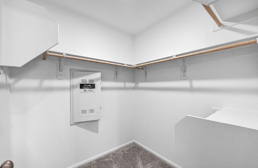 • Spacious walk-in closet with shelving, single pole hanging space and one vertical set of 5-shelves (location per plan)