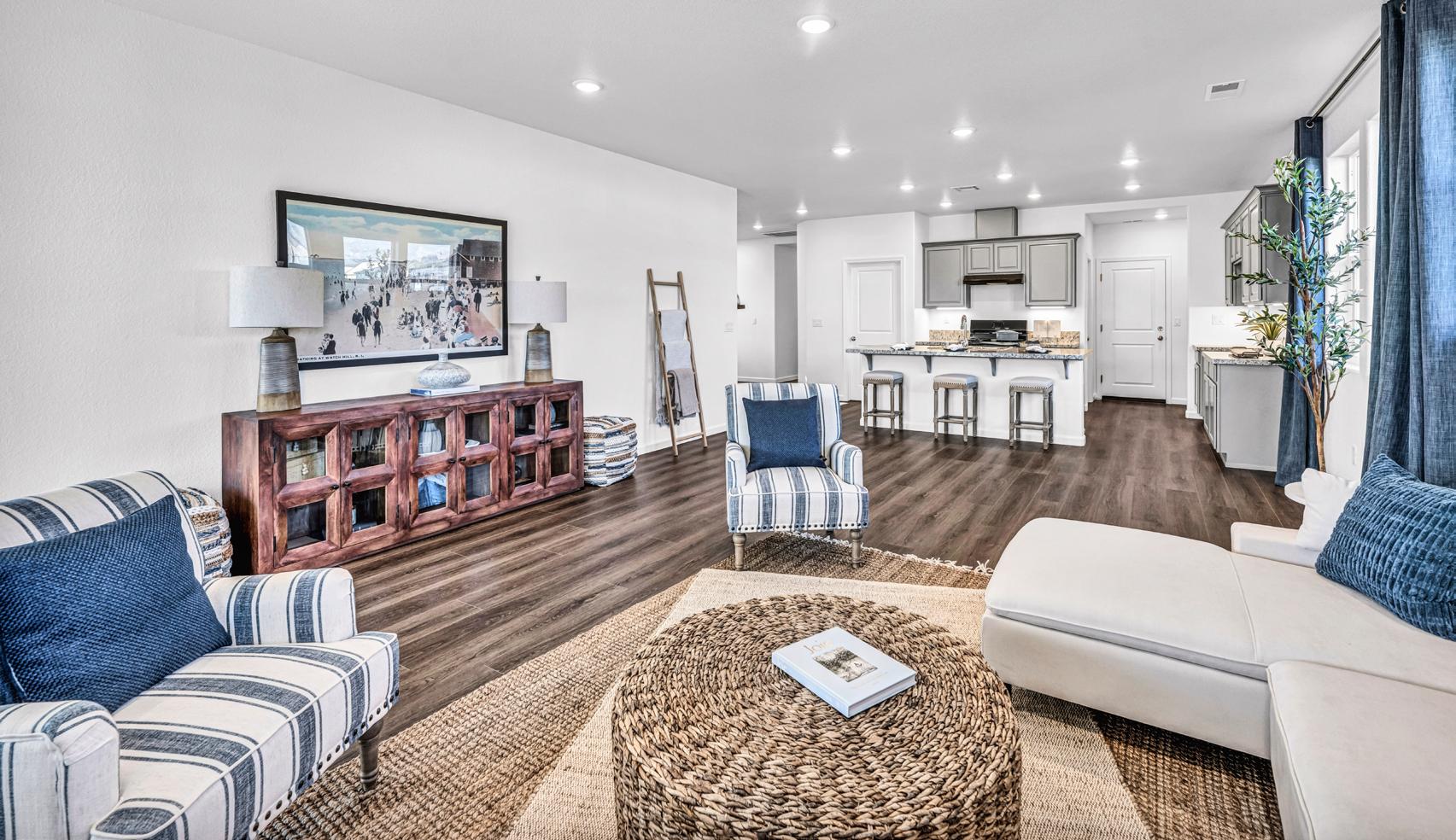 This 1,765 square feet floor plan exudes upscale living with three bedrooms, a flex area, and two baths, providing plenty of space to unwind. The open-concept design creates a seamless flow between the living, dining, and kitchen areas, perfect for entertaining or family moments. The two-car garage adds convenience and extra storage. Inside, the master bedroom features a spacious walk-in closet, while a versatile area near the hallway can be customized as a home office, study, or reading nook. Enjoy contemporary elegance and serene living in this thoughtfully designed single-story home.