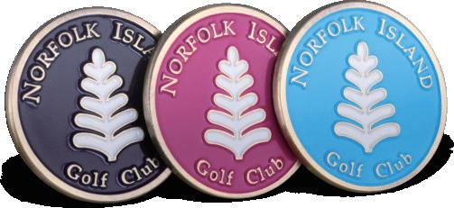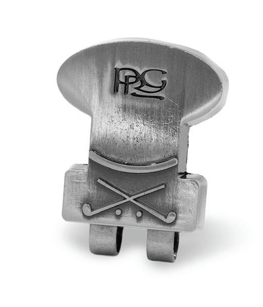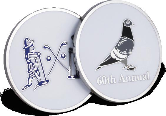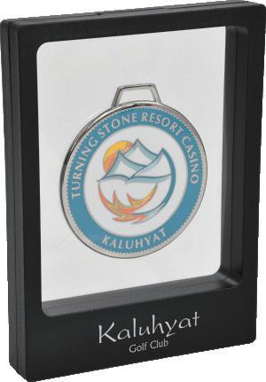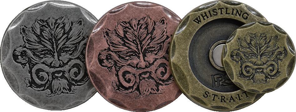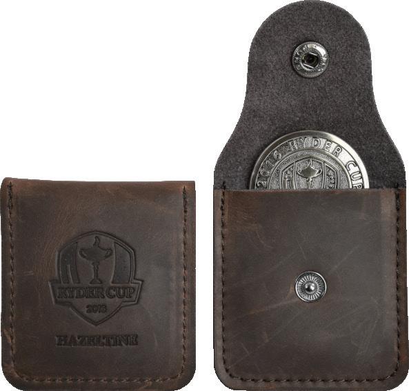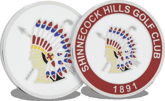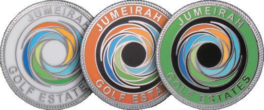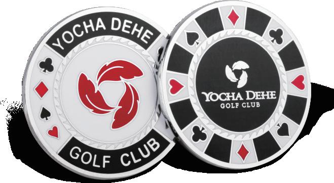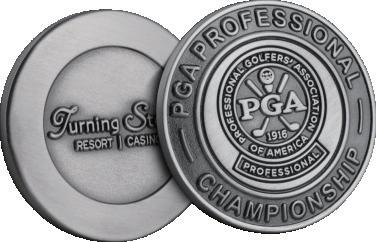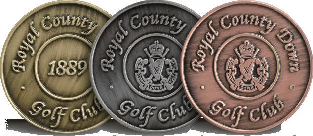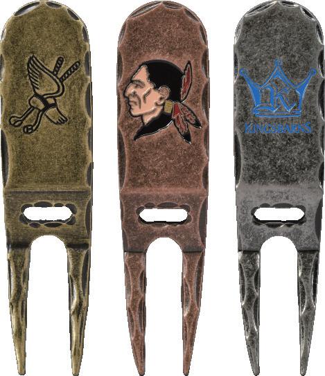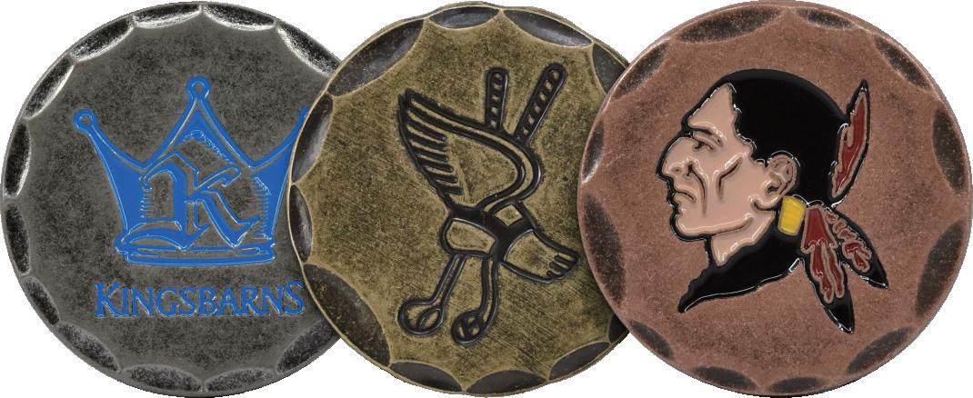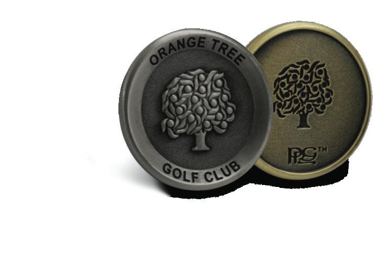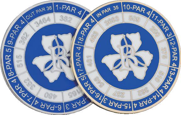 Made of copper and designed to show the front and back nine yardages of your course Size: 42mm | MOQ: 150