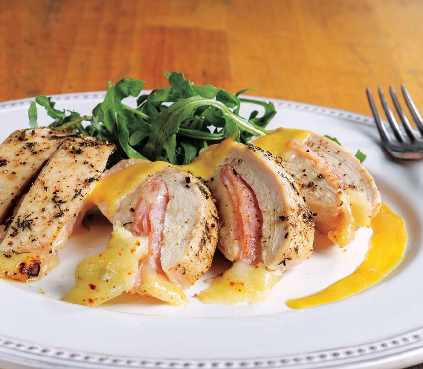 1. Preheat oven to 350°; spray rimmed baking pan with cooking spray. Slice chicken breasts horizontally in half, but do not cut all the way through. Open chicken breasts and spread flat, cut side up; cover each with 1 slice each ham and cheese. Fold chicken breasts to enclose filling; place on prepared pan. Brush chicken with oil; sprinkle with thyme and pepper. Bake chicken 30 minutes or until internal temperature of chicken and filling reaches 165°; let stand 5 minutes.