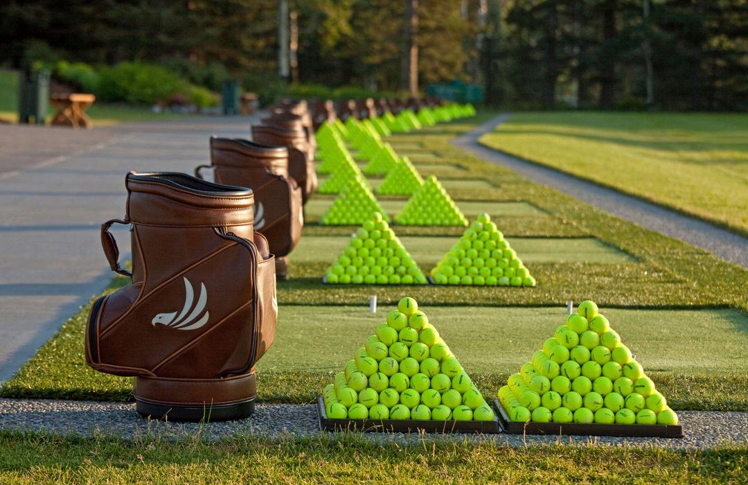 practice facilities: driving range, short game, putting green, and chipping green bag drop