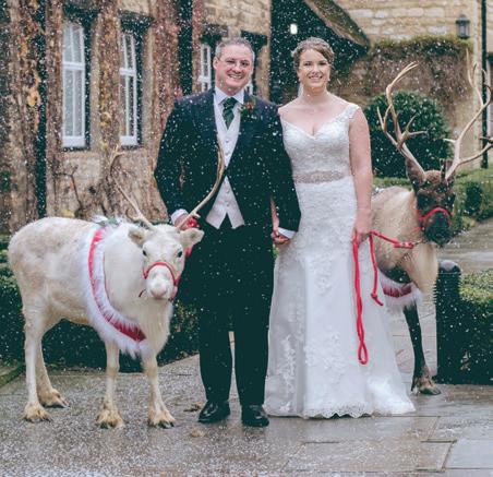 The choice of menu for the couple’s wedding breakfast was easy: who doesn’t love Christmas dinner? Meanwhile, Iced Delights supplied a three-tiered cake comprising a Christmas cake layer, and an apple and cinnamon sponge and a white chocolate and raspberry tier. Any other element to make the day special? Reindeer. And as luck would have it, Steph and Nick of Woodbine Farm were able to provide Snowflake and Tash, a couple of reindeer from their 17-strong flock. The couple also hire out snow machines and so they were able to guarantee a white Christmas for the couple’s day.