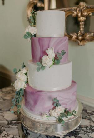 The couple’s wedding cake was created by the Melbourne Cake Company, comprising four layers which alternated between white and blush pink marbling, with white beading and roses to decorate. >>