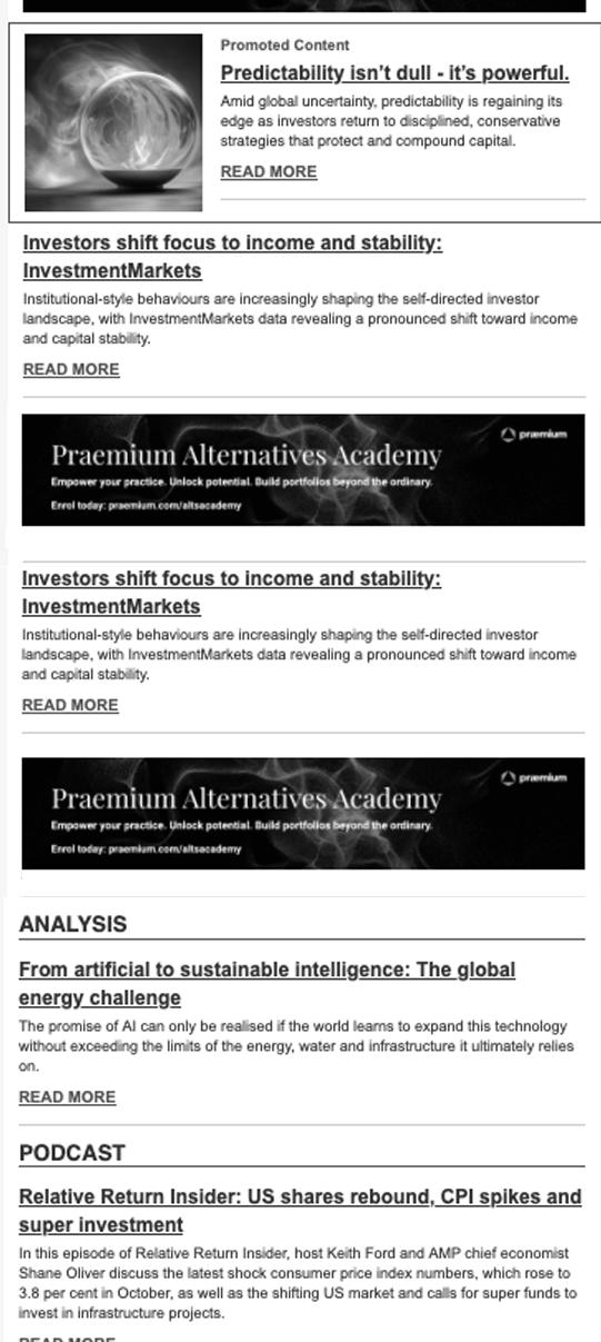 This media brand employs a strategic approach that has transformed the dynamics of the wealth management industry, adeptly merging new media with a sophisticated digital platform supported by big data. Investor Daily provides a comprehensive network, connecting the leading players in superannuation, funds management, platforms and insurance with intermediary distribution. Through an array of channels, including digital, social, research, broadcast, webcast, and events, Investor Daily empowers advertisers to connect with and influence their core customers and stakeholders.
