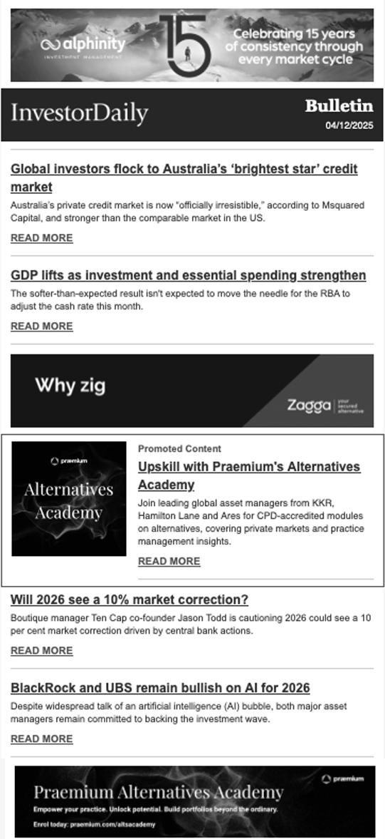 Investor Daily caters specifically to investment advisers, private wealth advisers, family offices, ultra-high net worth individuals, and wholesale investors.