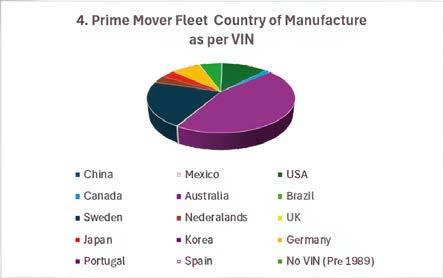 ARTSA-i Data also allows the country of origin of vehicles sold into the Australian market to be identi ed. This can be done by decoding the VIN. The rst character identi es the country of origin. Some vehicles get imported into Australia with an Australian VIN even though they were manufactured overseas. This can be corrected because the Model Approval document identi es the country of origin despite the VIN allocation. So ARTSA-i Data can be used to determine the level of heavy vehicle manufacture that occurs in Australia. Figure 4 shows the breakdown of the prime mover eet by country of origin. The analysis can be done for each year of manufacture. The data shows a signi cant increase over the past decade in heavy motor vehicles that were manufactured in Europe at the expense of motor vehicles manufactured in North America.