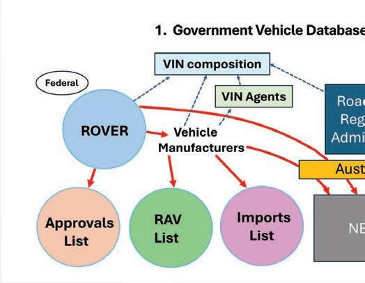 ARTSA-Institute has been analysing Australia’s heavy vehicles for the past decade. This project is called ARTSA-i Data. The information is derived from the National Exchange of Vehicles and Driver Information System (NEVDIS) database. This is the principal government database for road vehicles, registered or not. There are four ‘government’ databases relevant to the Australian vehicle eet. As shown in Figure 1, the Federal system generates three databases, which are: the Model Approvals list; the Register of Automotive Vehicles (RAV) and the Import Approvals list. The fourth vehicle database is focused on actual or potential road registrations. AustRoads, which is a service provider to the state and territory road agencies, is the ‘gate keeper’ and manages the Registration List called NEVDIS. The Vehicle Identi cation Number (VIN) is the common data between these vehicle lists. Except for very special cases, a road vehicle cannot be registered in Australia unless its VIN and make/ model details are in NEVDIS. A wheeled vehicle cannot be imported into Australia unless its VIN is in the Import Approvals list and sometimes vehicles get into NEVDIS via the Import Approvals list even though they are unlikely to be road-registered (for example, tractors and harvesters).