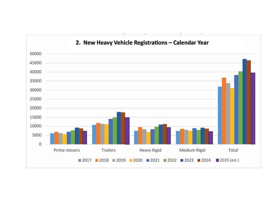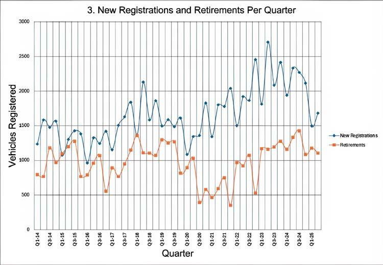 Figure 2 shows the history of new heavy vehicle registrations for the past nine years. The 2025 data is estimated based upon the available data for the rst three quarters. This year’s sales are comparable to 2022. ARTSA-i also identi es vehicle retirements. Figure 3 shows both new sales and retirements of prime movers over the past 11 years, per quarter year. As a guide, retirements are one third to one half of the new registrations, so the change in eet size is less than implied by new vehicle sales. The uptake of new safety technologies such as Antilock Brakes or Vehicle Stability Control can be estimated based upon manufacturer’s offerings and the date that the technologies were mandated in the ADRs. ARTSA-i can also study the retrorespective improvement in road safety