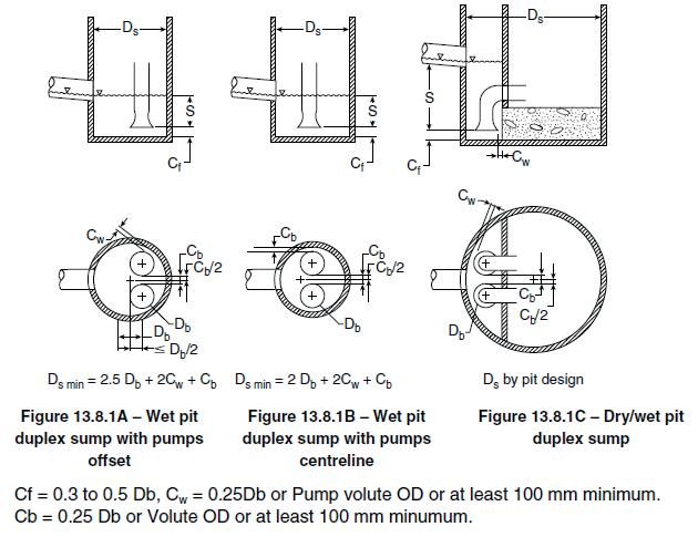This part has outlined what is required to design a range of sumps based on the size and types of pumps being used. However, we must emphasise that it is prudent, as noted in the text, that model testing is conducted to ensure that the intake design will work in practice, because there are quite a few variables noted above which could affect the operation of pumps in the sump.