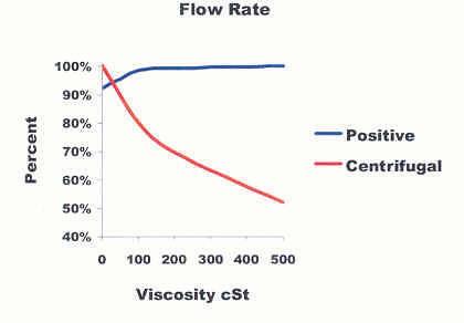 Viscosity impacts on pump performance in very different ways. Figure 2 shows how centrifugal pump performance reduces markedly as viscosity increases. It also shows that with a positive displacement pump, higher viscosity increases the flowrate. The reason for this is that slippage (flow back towards suction because of differential pressure) reduces with increased viscosity. The volumetric efficiency of positive displacement pumps increases with increased viscosity.
