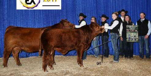 JSJ Baha 35B with calf, JSJ Sunny 69E Grand Champion Gelbvieh Female - Manitoba Ag Ex 2017