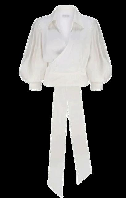 CREATE A CHIC MONOTONE LOOK WITH A STATEMENT WHITE BLOUSE, AND PAIR WITH BLACK HEELS FOR A SLEEKANELEGANTLOOK.