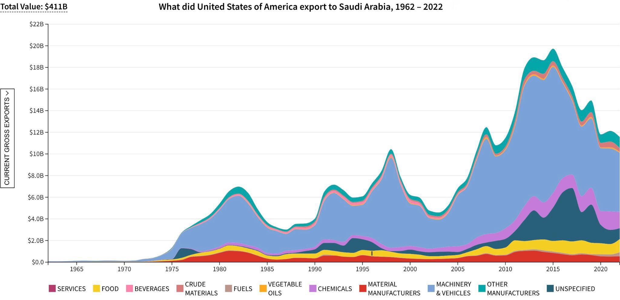 The United States and Saudi maintain a robust economic relationship. In 2022, total U.S.-Saudi trade in goods and services reached $46.6 billion, with crude oil exports dominating U.S.-Saudi trade. The United States exported $21.6 billion to Saudi Arabia and imported $24.9 billion from the Kingdom, resulting in a $3.3 billion U.S. trade deficit. The United States is Saudi Arabia’s fifth largest export destination, while Saudi Arabia ranks as the 30th largest U.S. trading partner.8