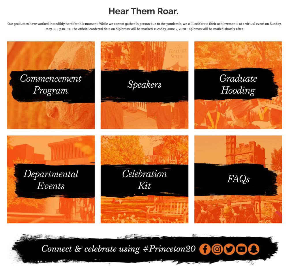 The School’s Office of Public Affairs and Communications volunteered to build Princeton University’s 2020 Virtual Commencement website — in just one week’s time. Building upon a template created by Web Development Services, the team aimed for accessibility and interactivity. The user-friendly website housed all pertinent information for students and their families, including a celebration kit with downloadable social media assets, a detailed FAQs page, the virtual commencement and graduate hooding