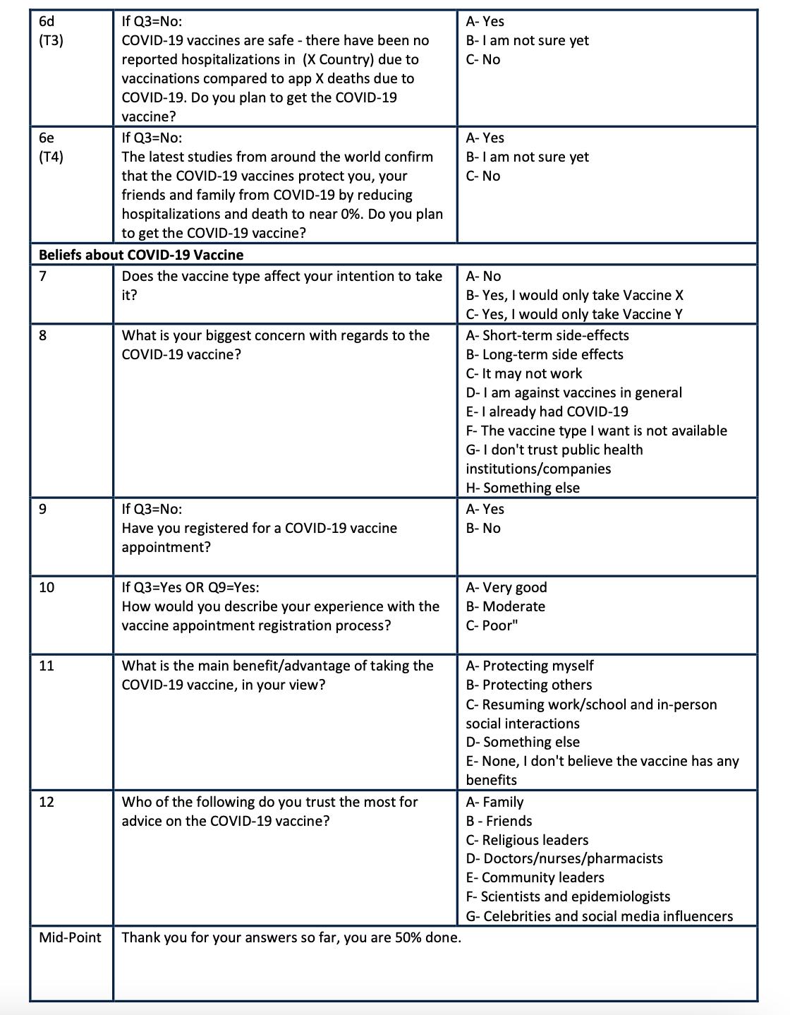 Since the literature has shown the mode of transmission of misinformation matters for designing an intervention,i we believe it is important to diagnose where individuals are getting their (mis) information from. The Africa CDC has reported some related statistics from their 15-country survey on misinformation. They found that 64% of respondents mention television as one of their most trusted sources for information about COVID-19, followed by radio (51%), online sources (41%), health institutions (23%), and government sources (18%). Africa CDC reported that these sources showed significant variation across countries, so it will be important to collect countryspecific data. In addition, the Africa CDC study surveyed respondents via both face-to-face and telephone interviews.ii Based on our conversation with the Gates Foundation, it seems that the results from face-to-face surveys and telephone interviews as compared to Facebook surveys are quite different; Facebook surveys consistently produce higher levels of self-reported hesitancy than other modes of surveys.iii