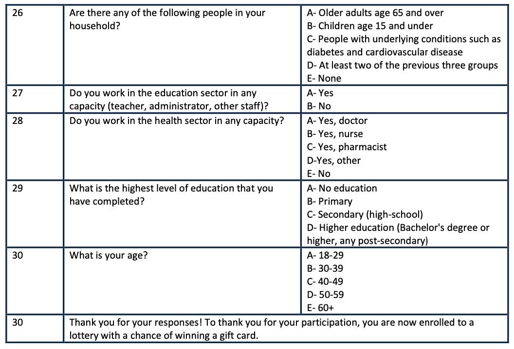 Based on our review of the relevant literature, we find five major thematic enablers of COVID-19 vaccine hesitancy: 1) health concerns and risk perceptions, 2) low trust in institutions, 3) automatic thinking and heuristics, 4) social processes, and 5) cultural and religious beliefs. Given time and resource constraints, we were unable to conduct primary research for this report. As a result, we relied on other scholars’ work on diagnosing vaccine hesitancy in sub-Saharan Africa to draft our original diagnostic questions.