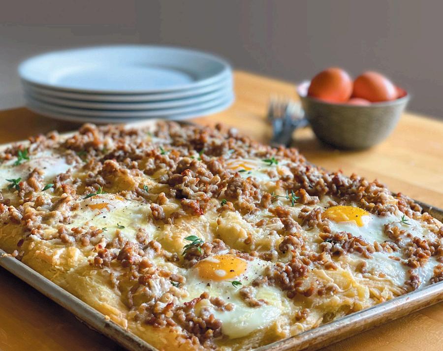 While the dough bakes, brown your sausage crumbles. When the timer goes off, pull out the bread, remove the foil balls, and very carefully crack an egg into each crater. (If the crater doesn’t look deep enough, you can hollow it a little more with a spoon.) Sprinkle on sausage and cheese. Return to the oven for 10 more minutes It should be golden, the cheese should be melted and browned, and the eggs should be done Sprinkle with herbs before serving