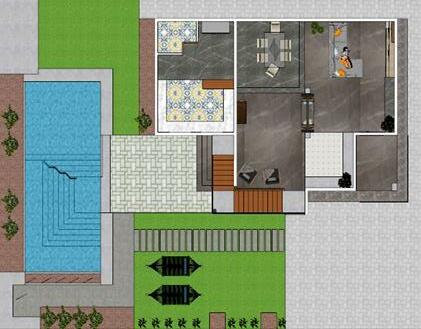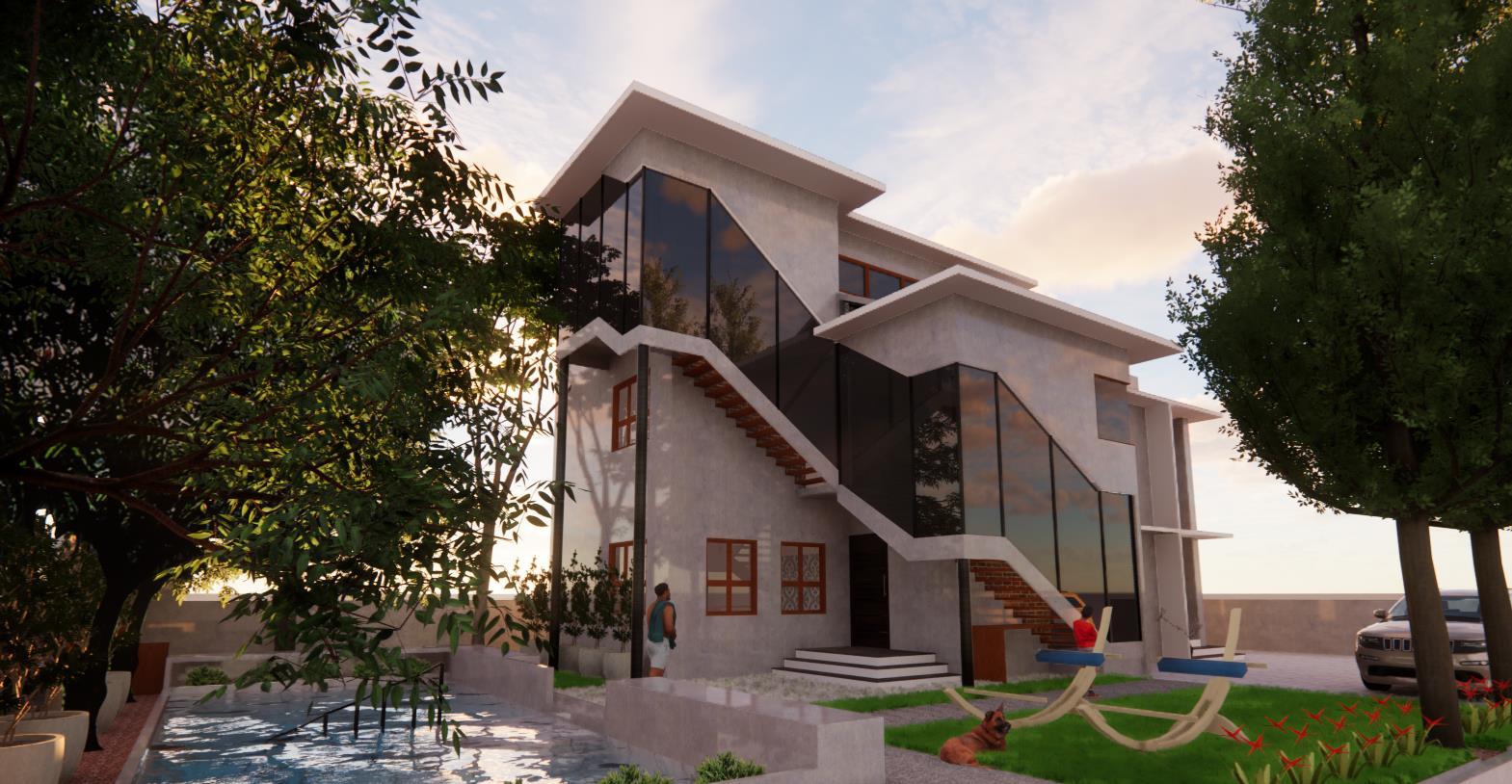 zone, the house is a concrete finish exterior with contrasting beautifuljaali work on front façade. Ideally south side placed windows give good quality light throughout the day. Functional rooms with working stations, day bed corner windows, walk-in wardrobes come with contrasting textures shades of concrete finish. Wooden panels on the inner side of sun-shades give a sensual view through windows. A waterbody located in the middle of the residence ensures the space remains cool in spite of the excess natural light.