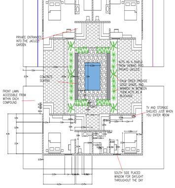 A repeating unit or an ace design element that repeats throughout the structures is this particular courtyard with a surrounding seating and a central koi pond with thin wood trees and shrubs as a partition. The philosophy being that enjoying and connecting with nature can become the barrier that reminds us from going overboard.