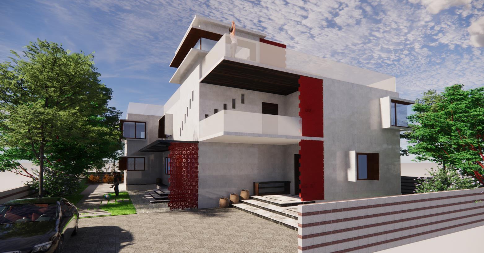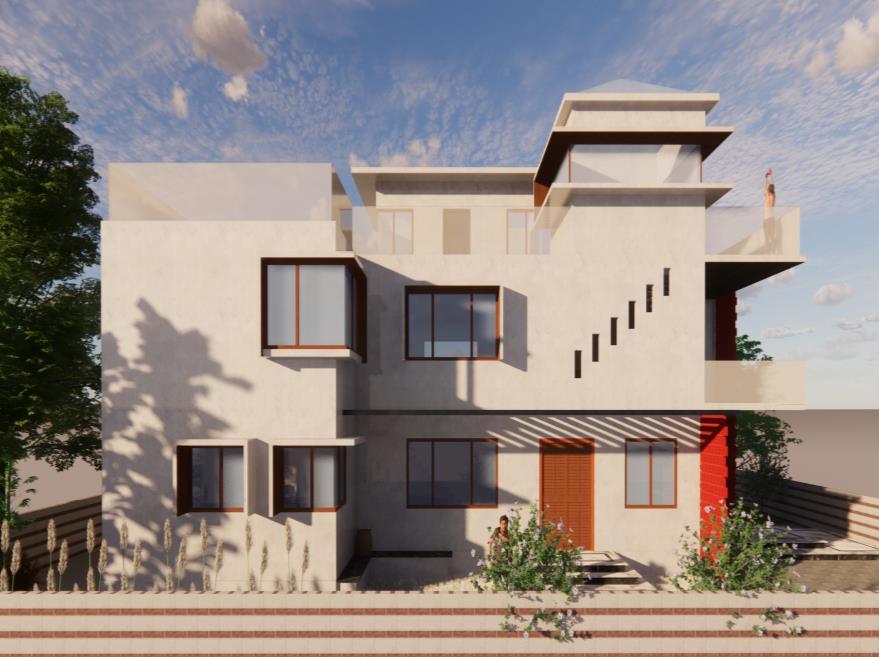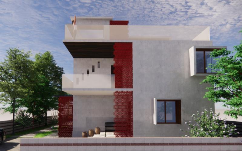 Description: • 70’ x 50’ site • Load bearing • G+2 private residence • Exposed concrete finish • Jaali walls • Indoor waterbody • Open to sky courtyard A private residence in the bustling