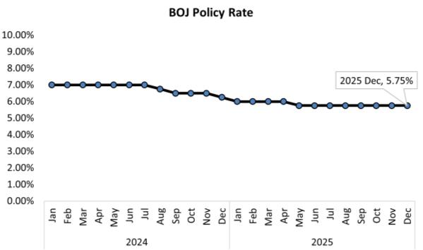 Given the sharp supply-driven inflation shock,theBankofJamaicamaintainedits policyrateat5.75%attheDecember2025 MPC meeting and signaled that no rate cutsareexpectedthroughFY2025/26and into the first half of 2026 (Figure 7). Inflation is now projected to breach the 4%–6% target range by early 2026, driven by both direct price increases and expected“second-round”impactsoncore inflation.