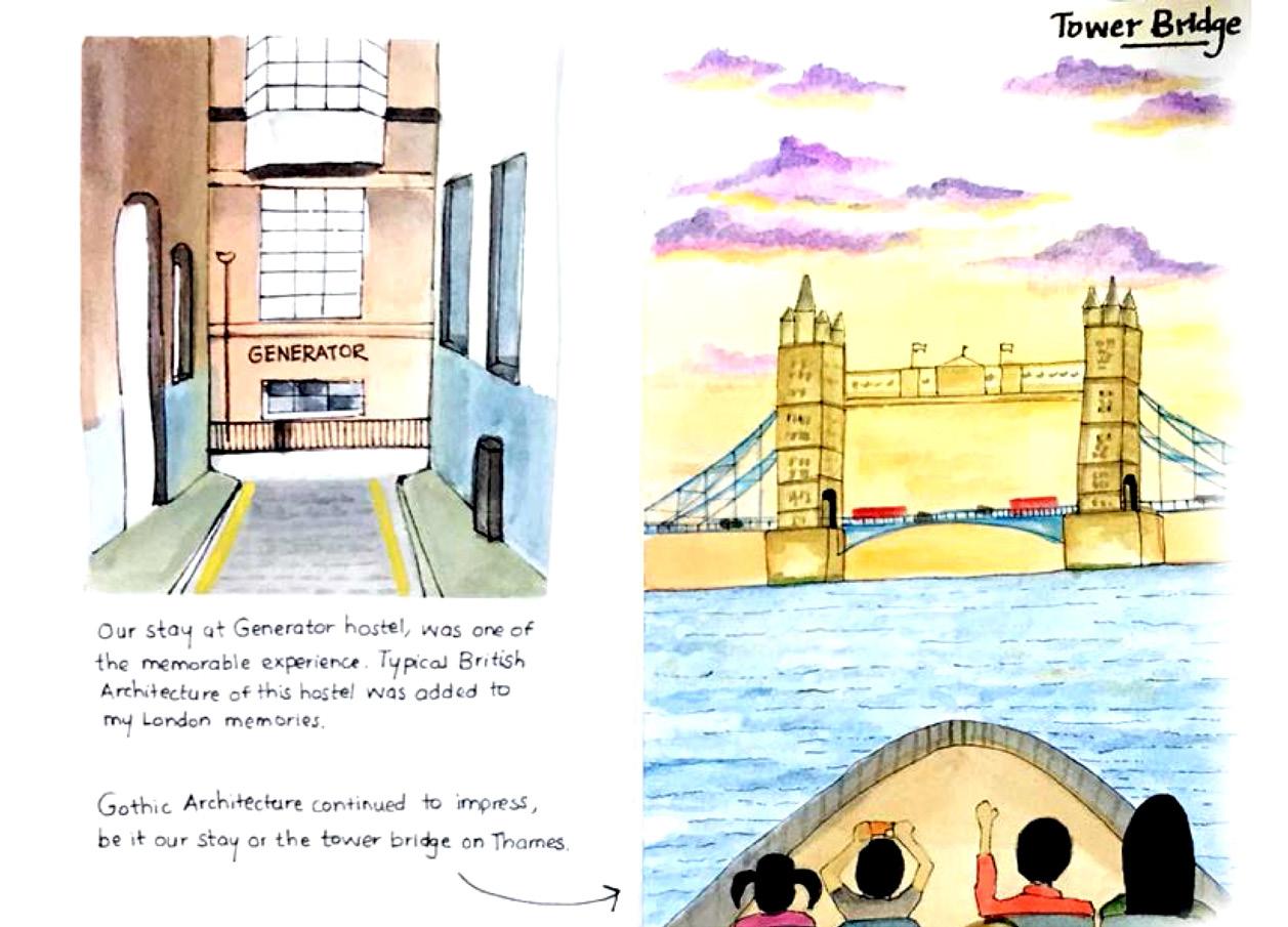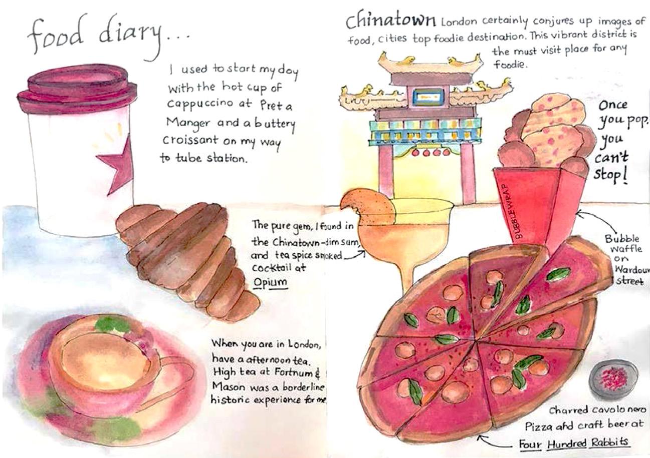 In 2018, I visited London as a part of the ‘Architecture knowledge expedition’. Always fascinated by the beauty of the city as shown in Bollywood movies, this girl fell in love with London. It wouldn’t be wrong to say that my love for London only grew stronger when visited this ‘Gorgeous’ (as the English say) city. The narrative is a series of sketches of my personal travel experience to London. I always wanted to recreate these memories and sketch it all out in a visual form encompassing its architecture and food. Starting the day with coffee at the Pret a Manger, hopping the tube with the cup of coffee in one hand and other having a to-do list for the whole day. Certain instances registered in my memory like walking through the busy lanes in London, exploring the food and the Architecture, bike rides from King’s Cross station to Generator hostel. Through this visual narrative, I wanted to capture tangible and intangible aspects based on my experience.