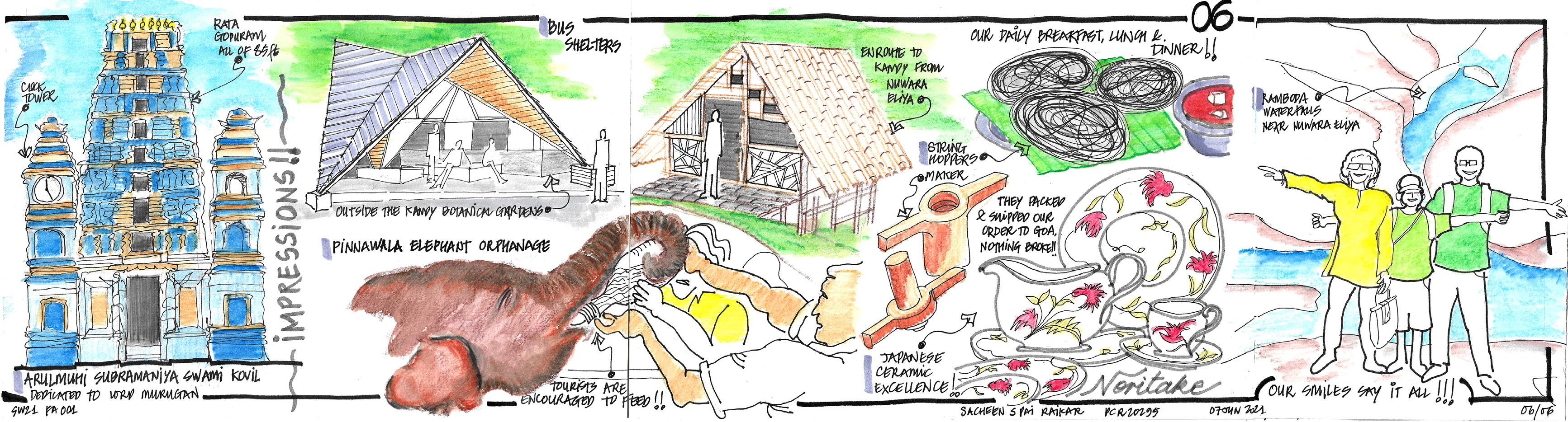 We took a road trip passing through 4 cities in the South of Sri Lanka in early November 2010. Landing at Colombo airport, we drove four hours straight to Ahungalla where we stayed at a beach resort designed by Architect Geoffrey Bawa. The next day we made a daytrip to his garden estate at Lunuganga. A day later we drove six hours to Nuwara Eliya, a hill station surrounded by tea estates, where we spent a cold night in one of the warmest of hotels. It took us three hours to reach Kandy, the following day, for a glimpse of the Tooth Relic Temple and the Botanical Gardens. We went up to the top of the hills overlooking this beautiful city before driving up four hours to Colombo. Walking around the city of Colombo, taking in the sights and food, followed by shopping, brought our short trip to a happy conclusion. The following sketches are an attempt to capture vignettes of our trip and share our experiences..