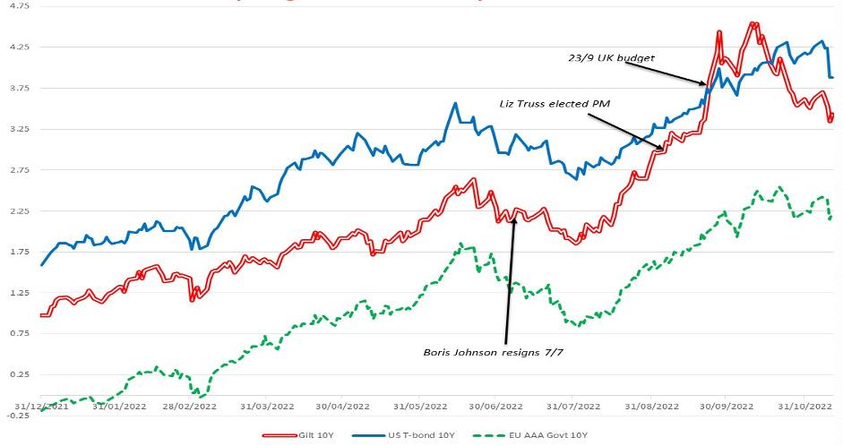 Figure 2 - UK Gilt vs. US Treasurey vs. EU yields yieldsFrom above, we can see that in the first half of 2022, UK Gilt yields were broadly rising in tandem with US T-bonds and other highly rated sovereign bonds. However, from the start of July – when Boris Johnson resigned – we see UK Gilt yields rising relative to other sovereign bonds, most likely due to the prospect of unfunded tax cuts and spending on energy support promised by Liz Truss spooking investors. Not just Rishi Sunak but even her own economic adviser, Professor Patrick Minford, warned that her tax cuts would drive up inflation and push interest rates up to 7% p.a.6