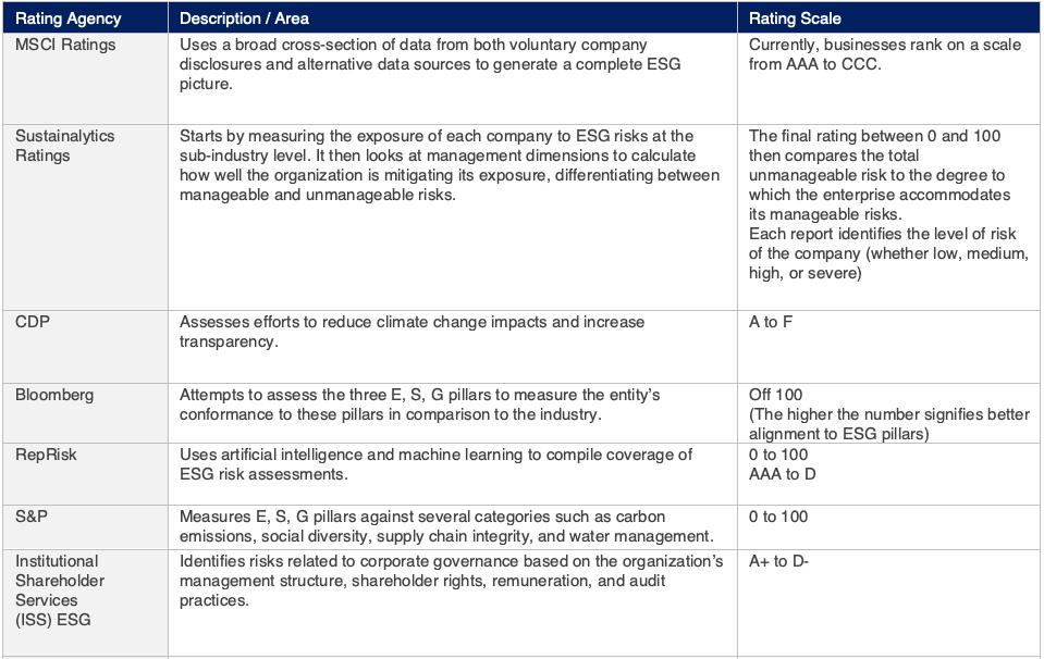 Table 1 below summarizes some of the different agencies that report ESG scores, detailing the rating scale adopted and the area of measurement.