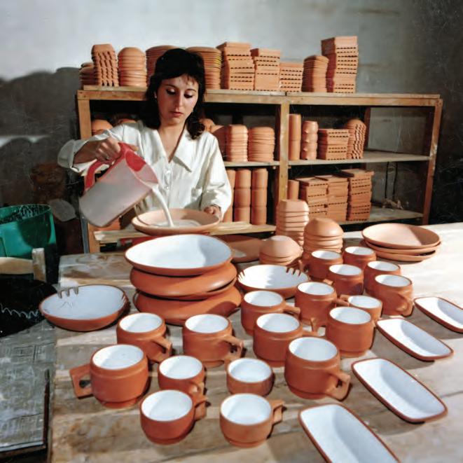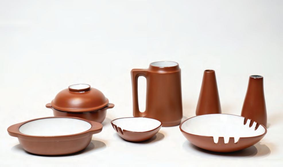 La serie de objetos seleccionados tienen en común la materialidad y la producción seriada. El gres es un tipo de pasta cerámica que permite espesores más finos que la cerámica de bazar y más gruesos que la porcelana. Se cuece a altas temperaturas para obtener un material resistente, impermeable y refractario. Es conocido por su durabilidad y resistencia a líquidos y cambios de temperatura. Los productos de Colbo recibieron la Etiqueta Roja de Buen Diseño del CIDI en 1967 y un reconocimiento en la sección “Industrias no convencionales” de la Feria Uvexpo en 1971. El esmalte es decorativo y funcional, actúa como una capa protectora e impermeable, que es indicativa de la función y optimiza la higiene. La morfología de esta vajilla nació de un accidente creativo: como el gres se deforma al ser horneado en lugar de pelear contra molinos de viento, se capitalizó el conocimiento y así surgió la forma triangular característica.