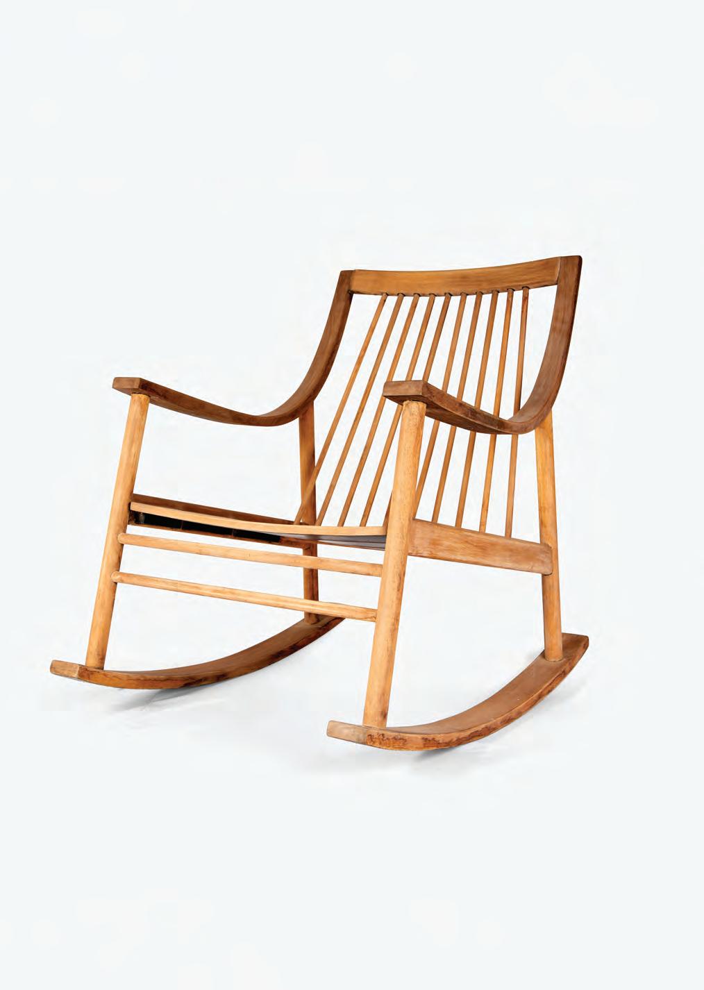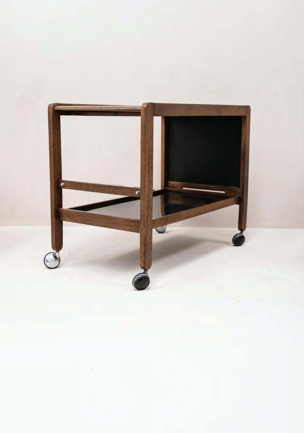 El bar o mesa auxiliar de bebidas cuenta con una tapa superior abisagrada que permite duplicar su superficie útil cuando está en uso, mientras que en situación de guardado es una estructura compacta. El doble plano de apoyo es característico en este tipo de mobiliario de servicio. La madera oscura y el laqueado negro refuerzan su carácter sobrio y masculino. El Sillón Hamaca Pepa HM/I es un heredero argentino que combina la estética escandinava moderna al mostrar orgulloso su estructura de madera, con el diseño inglés, a través de su reminiscencia a las clásicas sillas Windsor cuyo respaldo se concreta con sendas varillas dispuestas en forma de abanico. La funcionalidad ampliada se logra al conectar sus patas por su parte inferior con una piezas que permite el balanceo estable y seguro. El sillón fue premiado con el Sólido de cobre por el CIDI, en 1965.