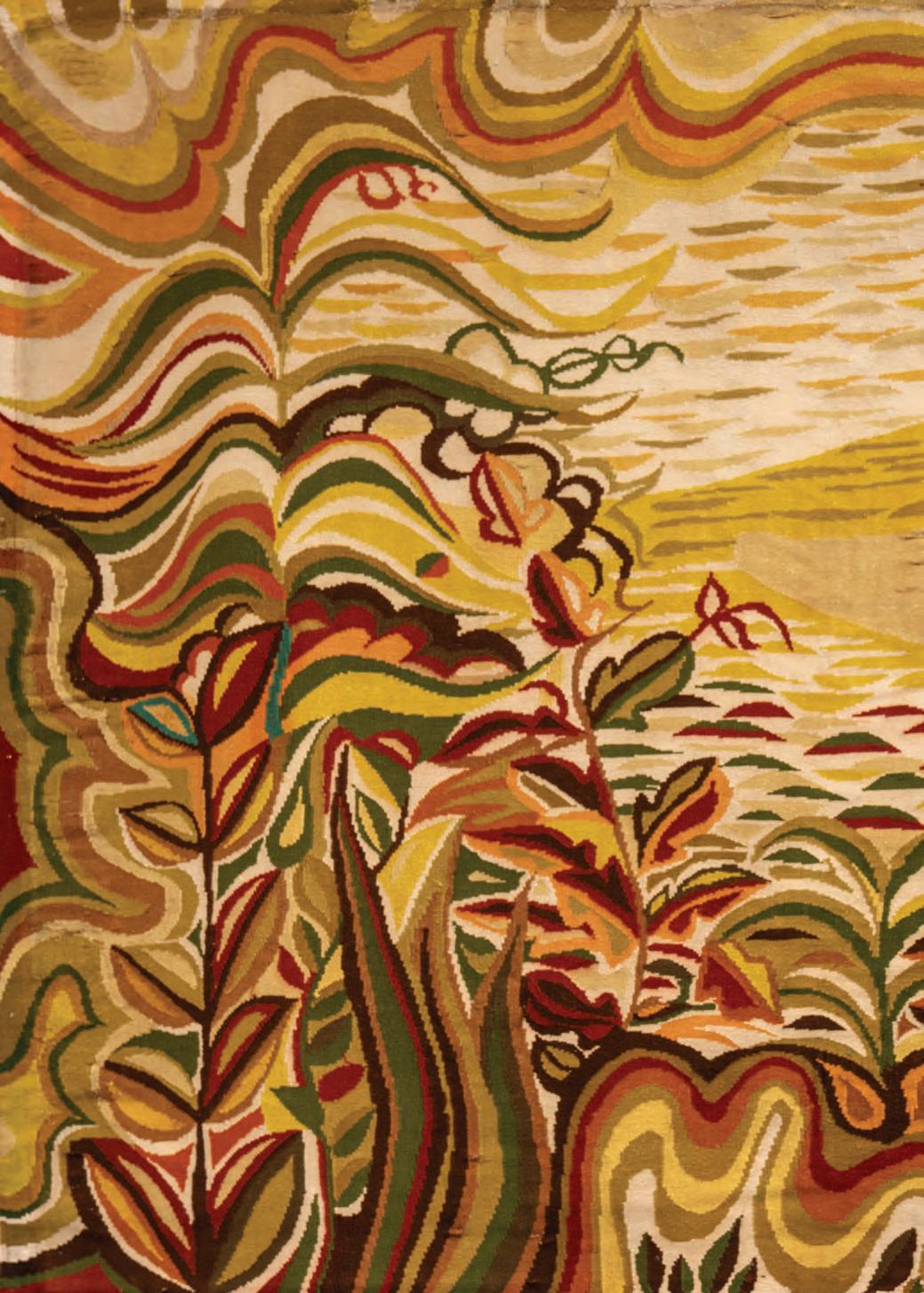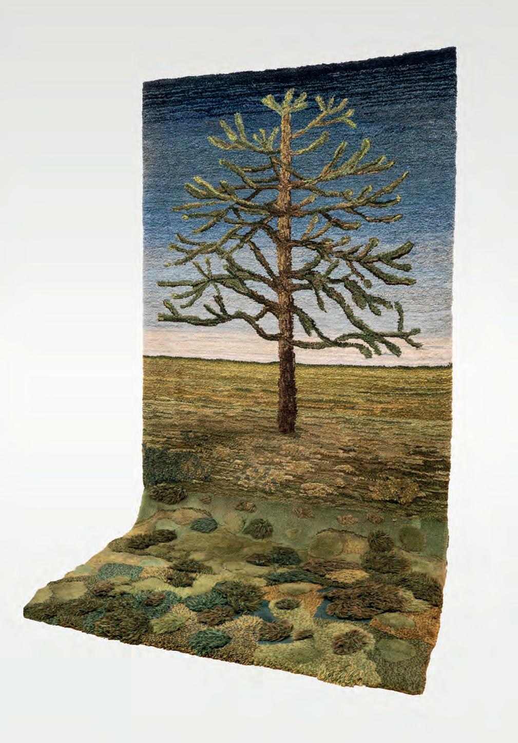 Bosques horizontales, cuyas raíces salen del plano y se expanden, árboles como protagonistas de una búsqueda intensiva sobre los territorios. Arqueóloga del paisaje, la artista teje y le da forma a sus obras a partir de experiencias inmersivas: travesías en kayak o largas jornadas en la naturaleza. El árbol que integra este tapiz dialoga con una obra de la serie Pastizales, un homenaje al suelo pampeano en forma de trama textil que lo inmortaliza. La obra, a su vez, funciona como un catalizador de recuerdos de diversos paisajes nativos que la artista transitó y desea preservar del paso del tiempo. Sus pastizales, potreros, refugios, tapices y escudos salen de la caja para invitar a una experiencia sensorial única.