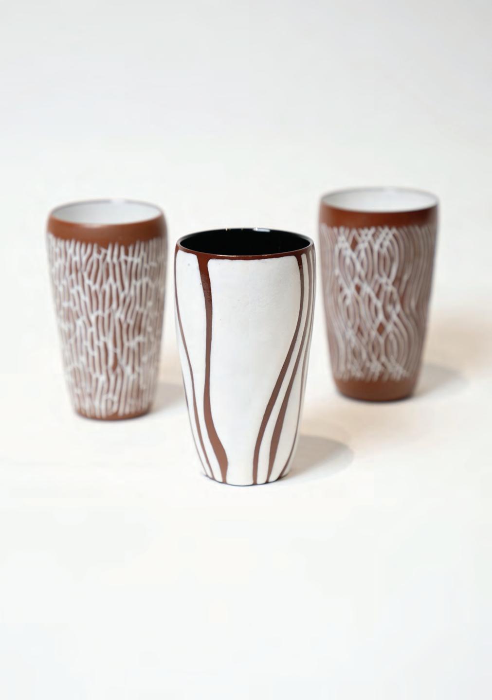 La laguna es un tapiz de lana, tejido de forma integral a mano en el Taller El Sol, que repiensa la representación de la naturaleza a través de líneas que generan un juego óptico. Este tapiz se vale primordialmente de una paleta de colores tierra. Es casi una epifanía que proyecta un denso bosque y deja entrever por un claro, una apacible laguna lejana. Es una pieza que coquetea con el surrealismo, pero también con el arte abstracto y el geométrico. El juego de café Petunia, recupera y sintetiza de forma magistral el gesto necesario para beber la infusión. Con una morfología estilizada, en donde predominan las líneas verticales, que refuerzan la esbeltez de la forma, Robirosa impregna las piezas con una paleta de colores cálida de aplicación irregular, que hacen énfasis en su carácter enérgico y vigoroso.