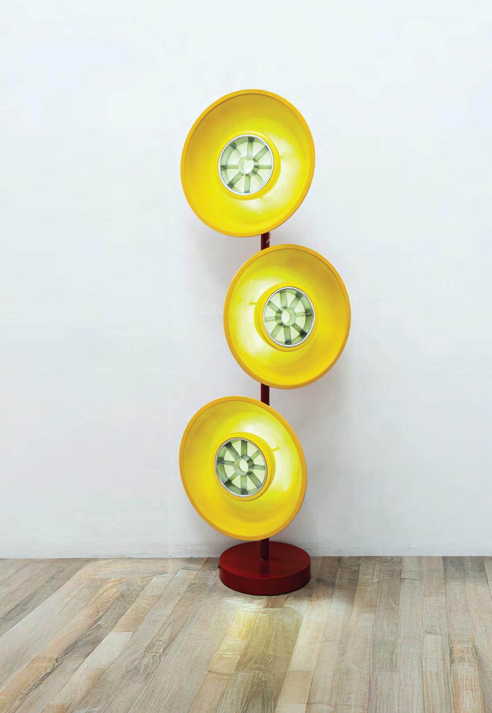 Triplexa, es el resultado de una convocatoria que la invita a realizar una serie de obras utilitarias, que la aleja de su práctica habitual y la desafía a proyectar fuera de su zona de confort. Tiene su génesis en objetos profundamente citadinos, encontrados en la calle. En este caso, pantallas industriales que construyen la espacialidad como una coreografía de tensiones: entre lo técnico y lo sensible, entre la repetición del módulo y la singularidad del gesto lumínico. Lo que subyace en la elección del objeto encontrado guarda relación con la economía de recursos, con la cuestión económica del proyecto y, al mismo tiempo, se entrelaza con el paisaje urbano. Es una declamación que irradia un exceso de calidez, amplificando la función que busca representar ese entramado particular. La terminación superficial está realizada a mano e irradia un exceso de calidez, amplificando la función del color.