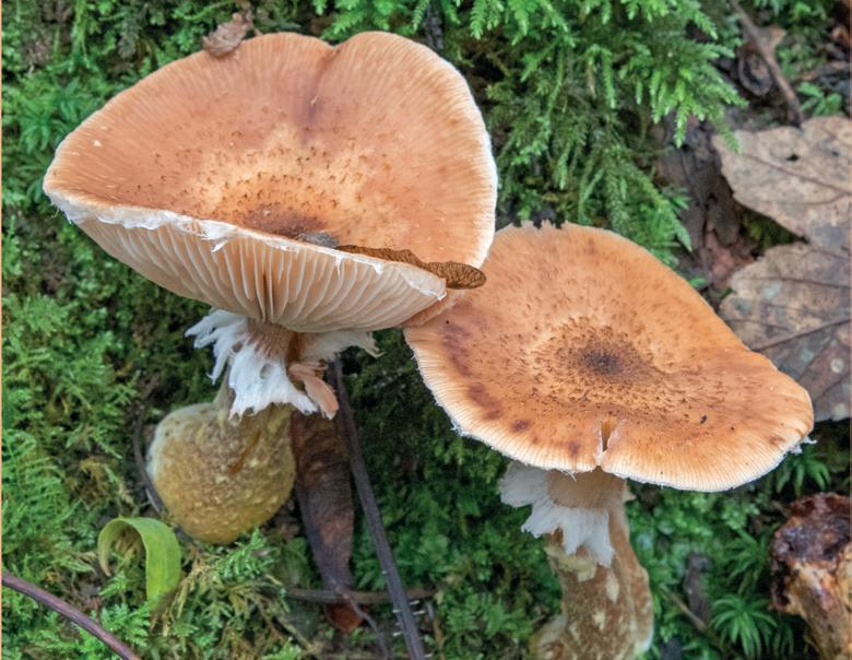 in the well-being of our woodlands. They form organic links with the roots of trees, described as mycorrhiza. It involves a two-way exchange – the tree provides the fungus with food in the form of sugars generated through photosynthesis, and the fungus provides the tree with water. This can be critical in times of drought because an extensive fungal mycelium can store ten times the amount of water that a 50-foot beech tree can hold.