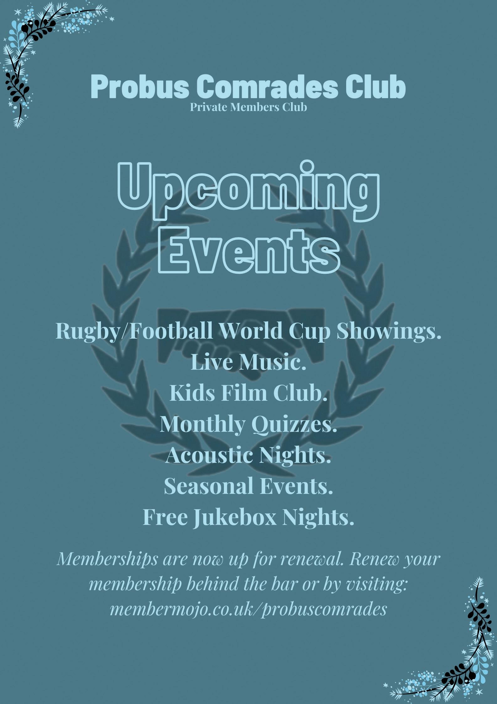 Probus Club of Probus: Thursday 19th December Christmas Luncheon at The Falmouth Hotel. Thursday 19th January Coffee Meeting at PVH. Thursday 16th February luncheon at The Falmouth Hotel with speaker Tony Watt