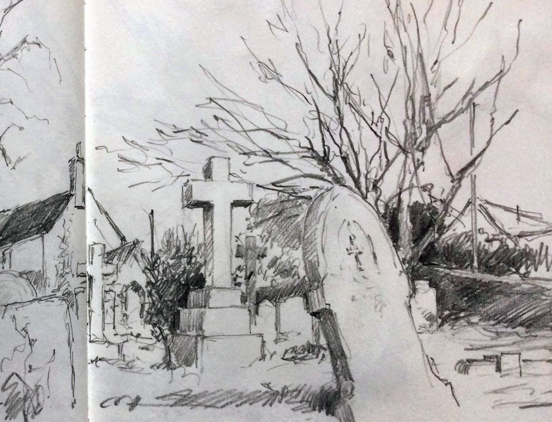 During one sunny winter’s afternoon I sat tight against the front boundary and completed another sketch, then moved to the south side. The graveyard seemed to have grown as more gravestones and inscriptions have become visible. It is very gratifying to see the work advance and it looks like this may turn out to be the start of a much longer project.