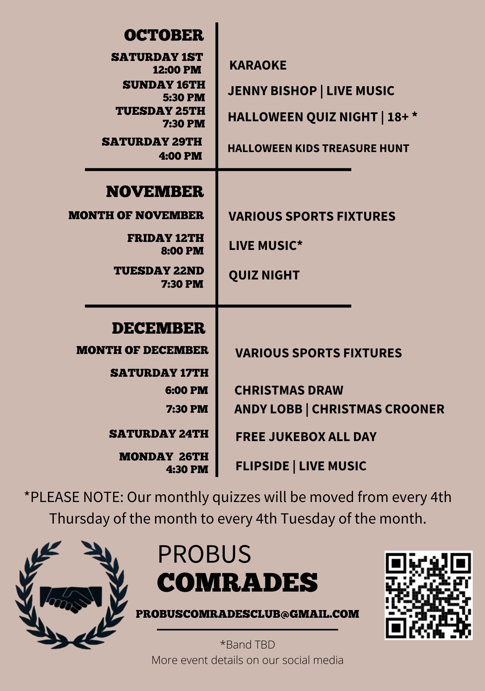Key: PVH = Probus Village Hall. PCC = Probus Comrades Club.