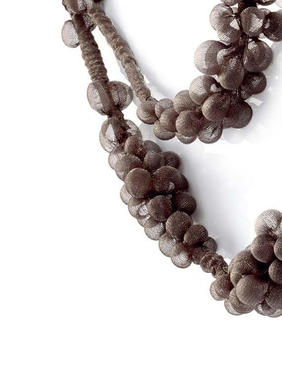 Like berries, the shimmering silver elements seem to have sprouted from the jewelry. The organic shapes and lively asymmetry give this necklace its special character. The necklace is made of soft, high-quality organza in a mysterious deep brown and silver. The effect of the dimensional stability is amazing. All the items are pressure-resistant and easy to clean.