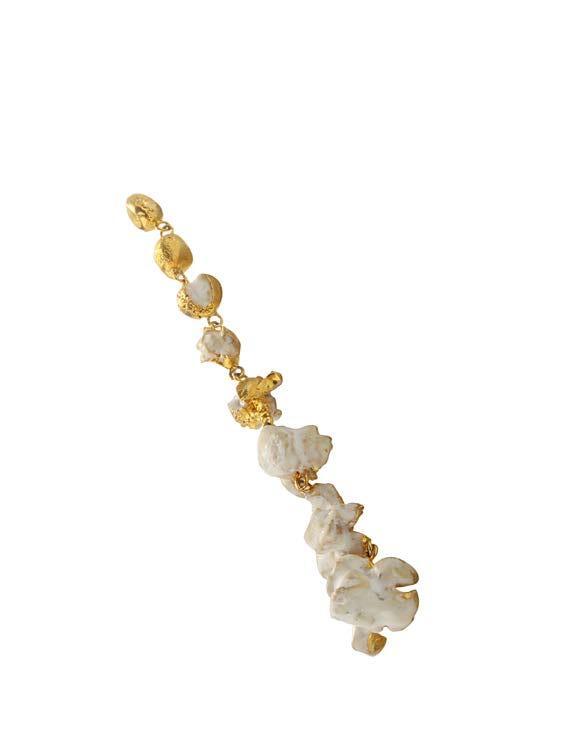 Hanging fragment... like a precious memory, memory of a recent past. Some cracks and crevices reveal “precious traces” of gold. Semi-circular in concrete, the set is suspended between two gold-plated steel cables covered in nylon in 2 parts, to a kind of traverse (brass) twisted appearing as a ribbon and on one side a few gilded links of a chain. Thin and light, it will complement a simple and clean lines clothing.