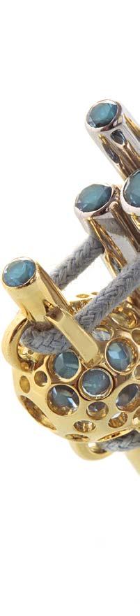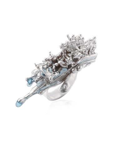 The ring is inspired by the belief that everything is interconnected in the universe. The artist reflects the cosmic connection concept through a thread that unites two planets, or, as he also interprets, two persons. The ring is made of 14K white and yellow gold with the use of hand wax carving technique and is set with blue topazes. All the elements of this wearable object of art are assembled by hand through one single elastic thread.