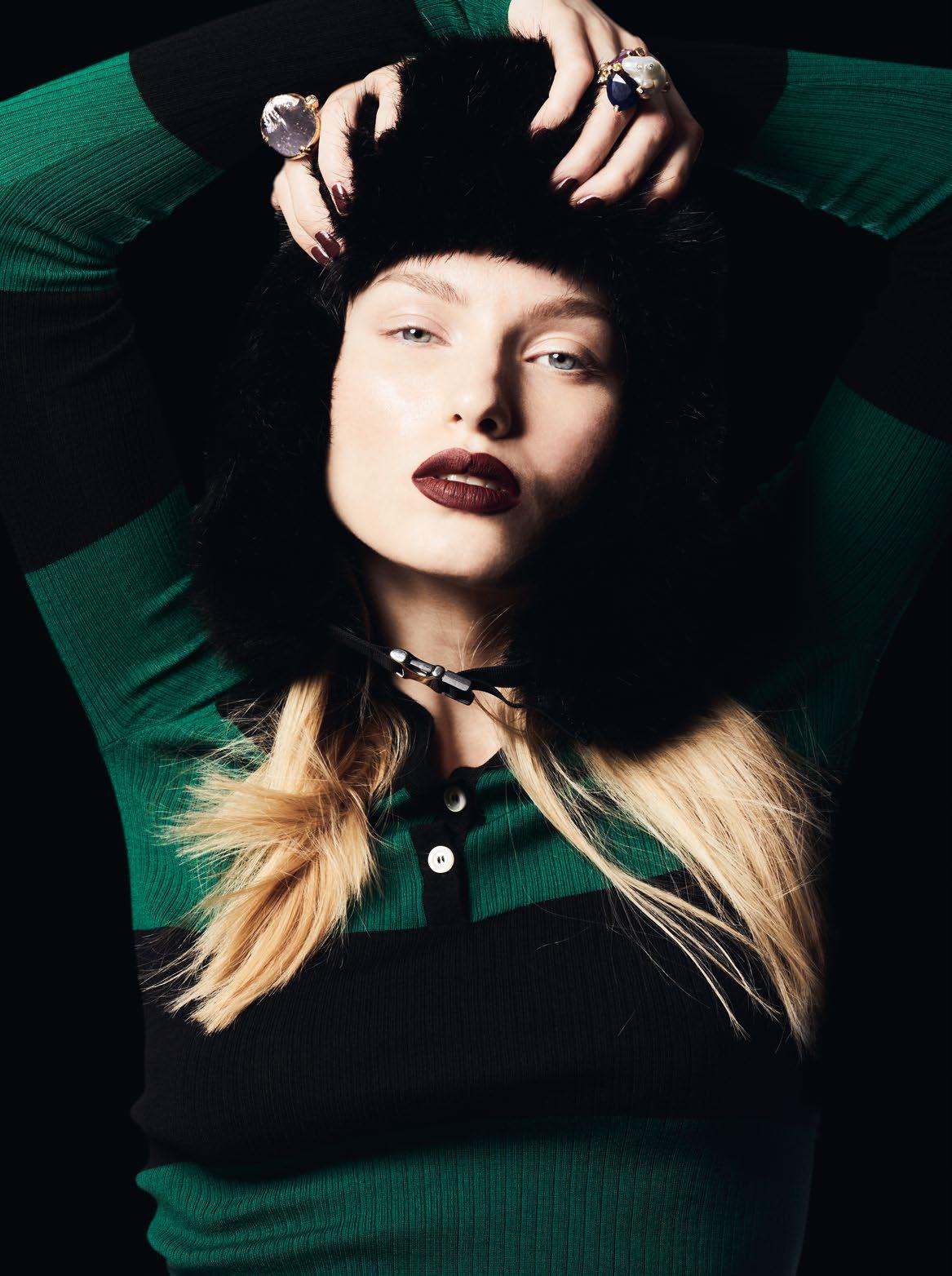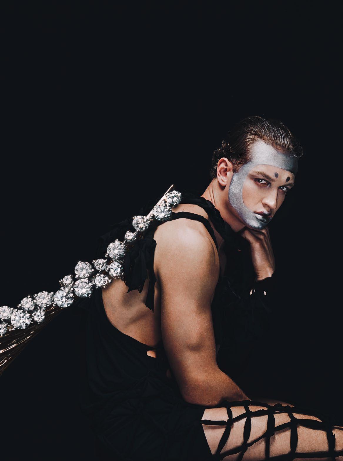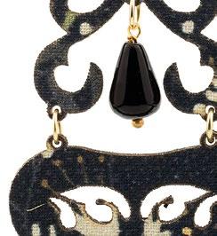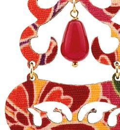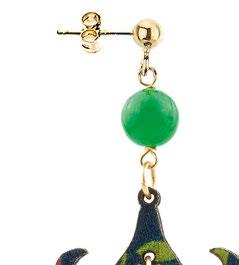Opening page: earrings in yellow gold with black onyx from the Naomi collection. LUCEDEIMIEIOCCHI JEWELS. Vest: GIGLIO TIGRATO. Trousers: 9.8 INCH. This page: Falene bracelet in silver and enamel. FUTUROREMOTO. Total look: ROMEO GIGLI.