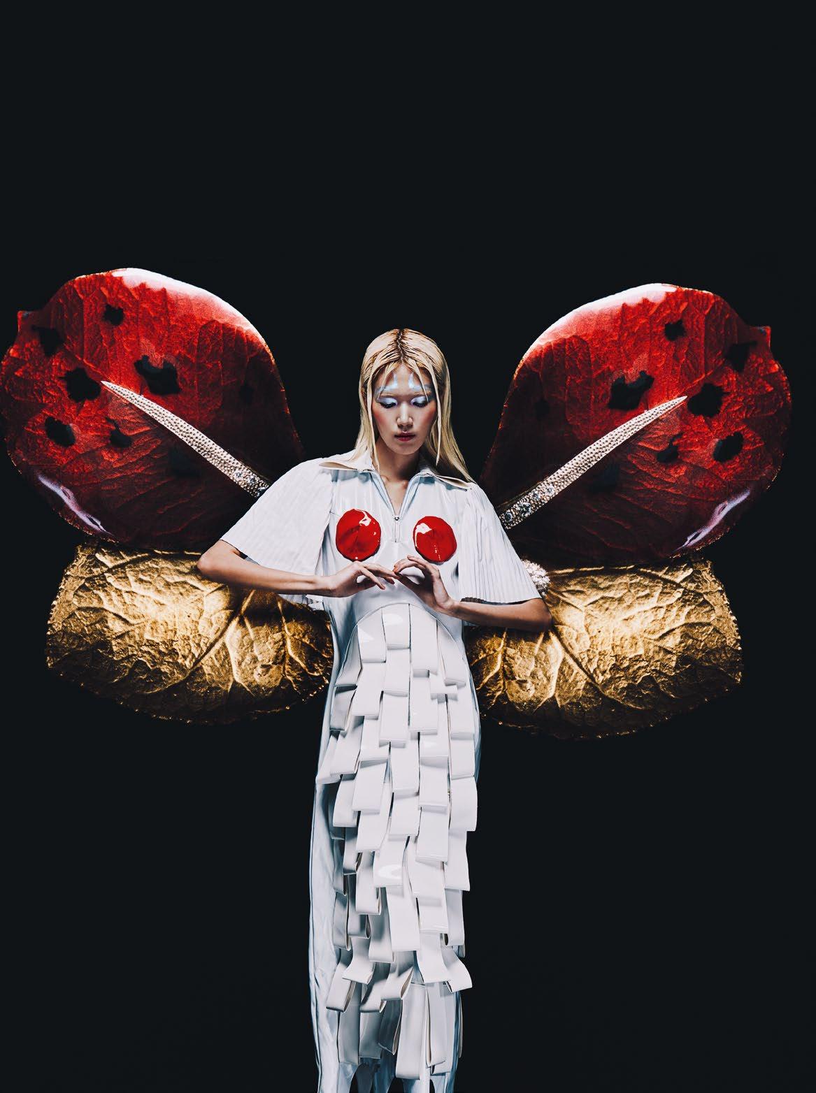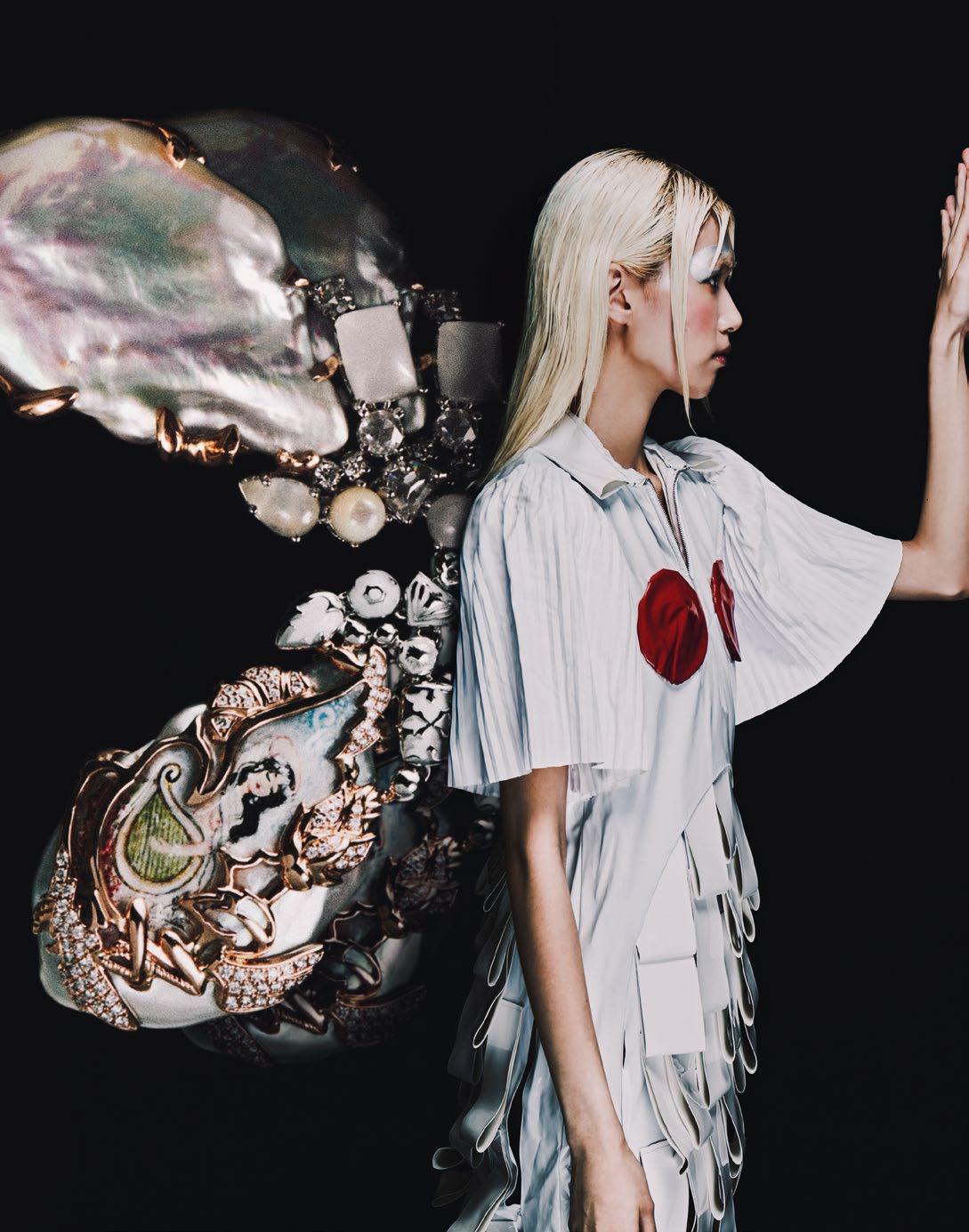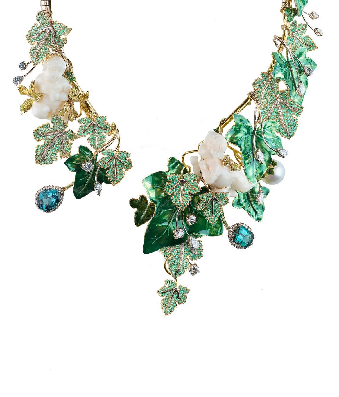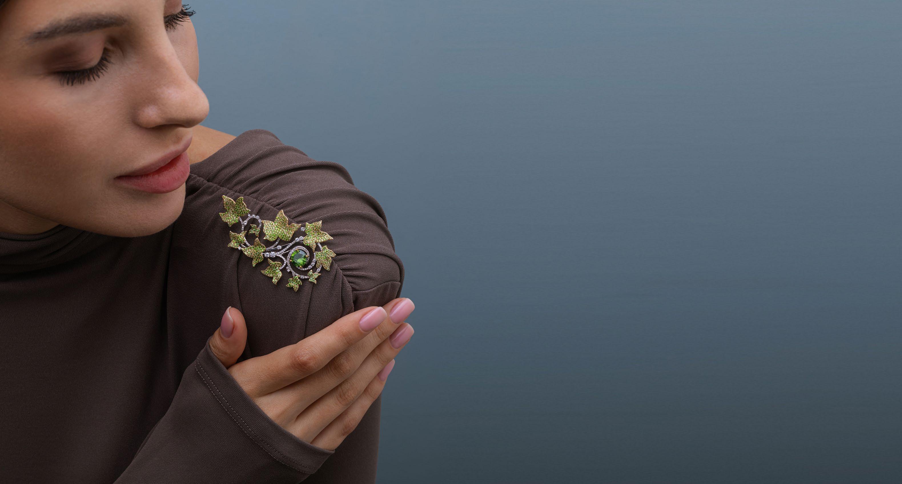 Foglia brooch: red enamel, yellow gold and round brilliant cut diamonds. Foglia brooch: yellow gold and round brilliant cut diamonds. Dress: ZHUOLIN HUANG.