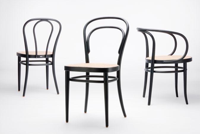 steaming which saturates the fibres (by means of treatment in an oven) and softens the lignin contained in the wood, making the cellulose more elastic. It was a revolutionary system also because after the bending process the dried wood retains its original strength. By not relying on expensive expert cabinetmakers, Thonet invented a system, in an industrial way using moulds, that was a cheap process achieving beautiful results that won over the general public. In a period when eclectic revivals were all the rage, chair no. 14 with the round seat ring and the backrest no longer attached but screwed, offered a style free from any historical reference, a measured simplicity that fits harmoniously in any environment, home and social, proof being a purist such as Le Corbusier placing it in his Pavilion of the Esprit Nouveau in 1925. Without doubt, the chair’s success also centred on the insightfulness to have distribution supported by a sales network that stretched not only across Europe, but also reached the United States from 1873 with offices in New York and Chicago.