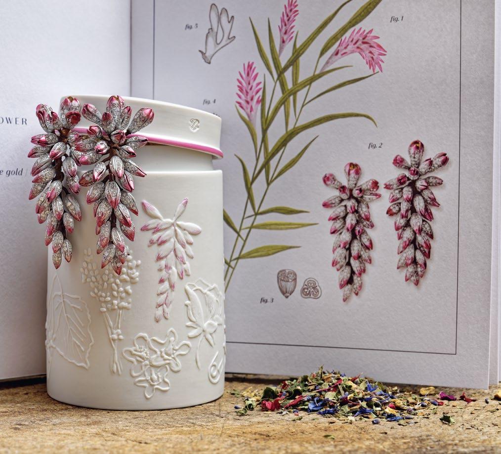- the Cinnamon Brooch, as Christian Hemmerle recounts: “The initial idea was to recreate a bronze cinnamon stick but during the designing the project was completely changed because the natural beauty of real cinnamon bark prevailed, which became the star of the brooch, combined with minimal use of bronze and white gold and a beautiful Fancy Deep Brown-Yellow diamond. It took months of testing with real cinnamon before arriving at a result that guaranteed aesthetic perfection, natural simplicity and stability!” The brooch therefore exudes the beneficial smell of the spice: just like the Lavender earrings - in aluminium, bronze, white gold and tanzanite - which can be opened to be filled with fragrant lavender flowers. Another piece destined to form part of Hemmerle’s history is the Orange Blossom brooch: it is the first jewel in the brand’s hundred-plus years not made entirely in-house: its beautiful porcelain stamen topped with a pair of natural golden pearls were actually made by the renowned Bavarian manufacturer, Nymphenburg: the same House to which Hemmerle has commissioned bespoke porcelain tea-caddies,