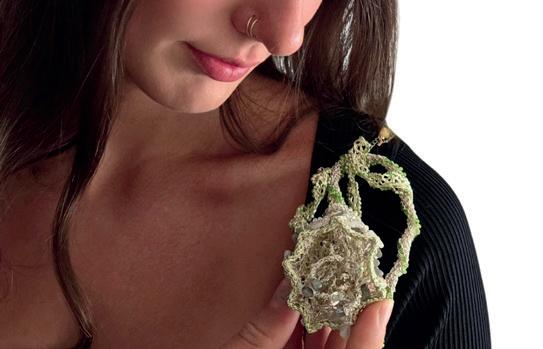 From the Belgian elegance of Berquin , with Calla Blossom and Rose Dew rings encrusted with VVS/DEF diamonds and designed for interchangeable stones, we move to the “slow” poetics of Casa Garimpo (Brazil): the Antique Earrings in 18 kt gold, mother-ofpearl, and garnets converse with the Silhouette Earrings in gold and aquamarines, created for the New York runway. The Nordic essentiality of Coreilla Jewelry (Finland) reinterprets pomegranate and rose in sterling silver with Juicy by Nature and Floral Mystique, blending contrasting finishes and finalist designs in national jewelry competitions. With DAMAST by LunaLotta (Belgium), silver and Damascus steel become metaphors of rebirth: bracelet and necklace “repair” fractures like a Western-style kintsugi.