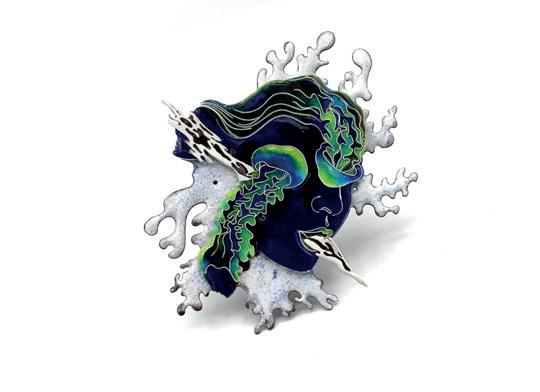 Veiled in Blue was conceived during a period of cognitive fog, marked by memory loss, emotional dissonance, and the loss of a loved one. Crafted in silver and enamel, the brooch features a veiled face obscured by jellyfish, reflecting blurred perception—seeing without clarity, speaking with unintended tension. Two smaller faces suggest conflicting inner voices. The piece resonates with introspective force and a distilled, poetic rendering of psychological fragility and unresolved inner motion.