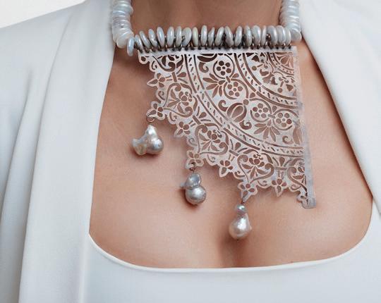 A voice whispers gently. A grandmother counts every stitch. Each thread—a gesture. Each loop—a legacy. This necklace is an homage to inheritance— to the quiet labor of women who shape the future with tenderness and strength. Inspired by the geometry of lace and the timeless glow of baroque pearls, it holds the intimacy of stories never written. One day, when she is no longer here, her children will feel it. That silent love arriving in its own time, like a ship on the horizon. They’ll know.
