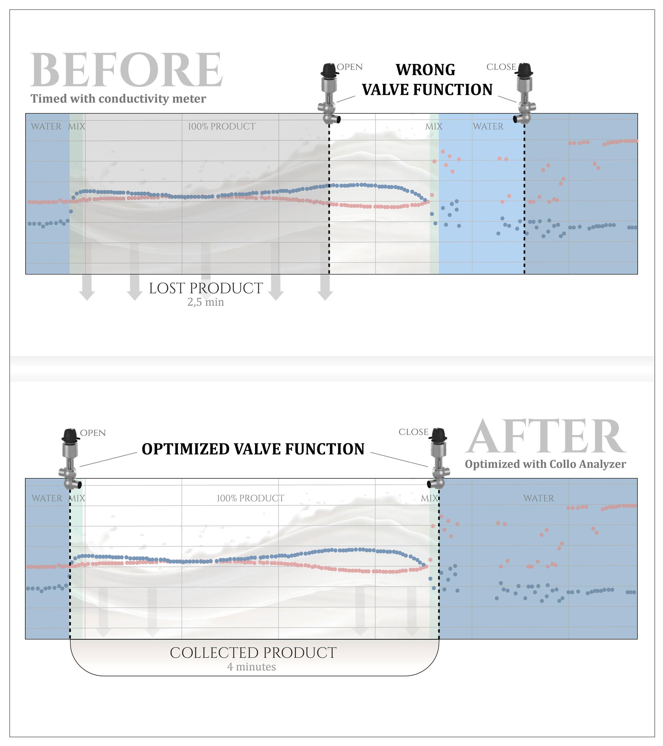 Collo sensors were recently installed in four locations in the raw milk reception of a dairy plant processing 243 million liters of raw milk per year. The plant previously used flow meters for controlling the push-outs. However, due to their low accuracy, what appeared to be optimal timing actually resulted in losses amounting to 600,000 liters per year. With the far higher accuracy of the dielectric sensor, 108 times better than the flow meter, losses were reduced to just 5,000 liters per year – a reduction by more than 99 %. The dairy has now decided to introduce Collo’s solution throughout the plant and to automate the process.